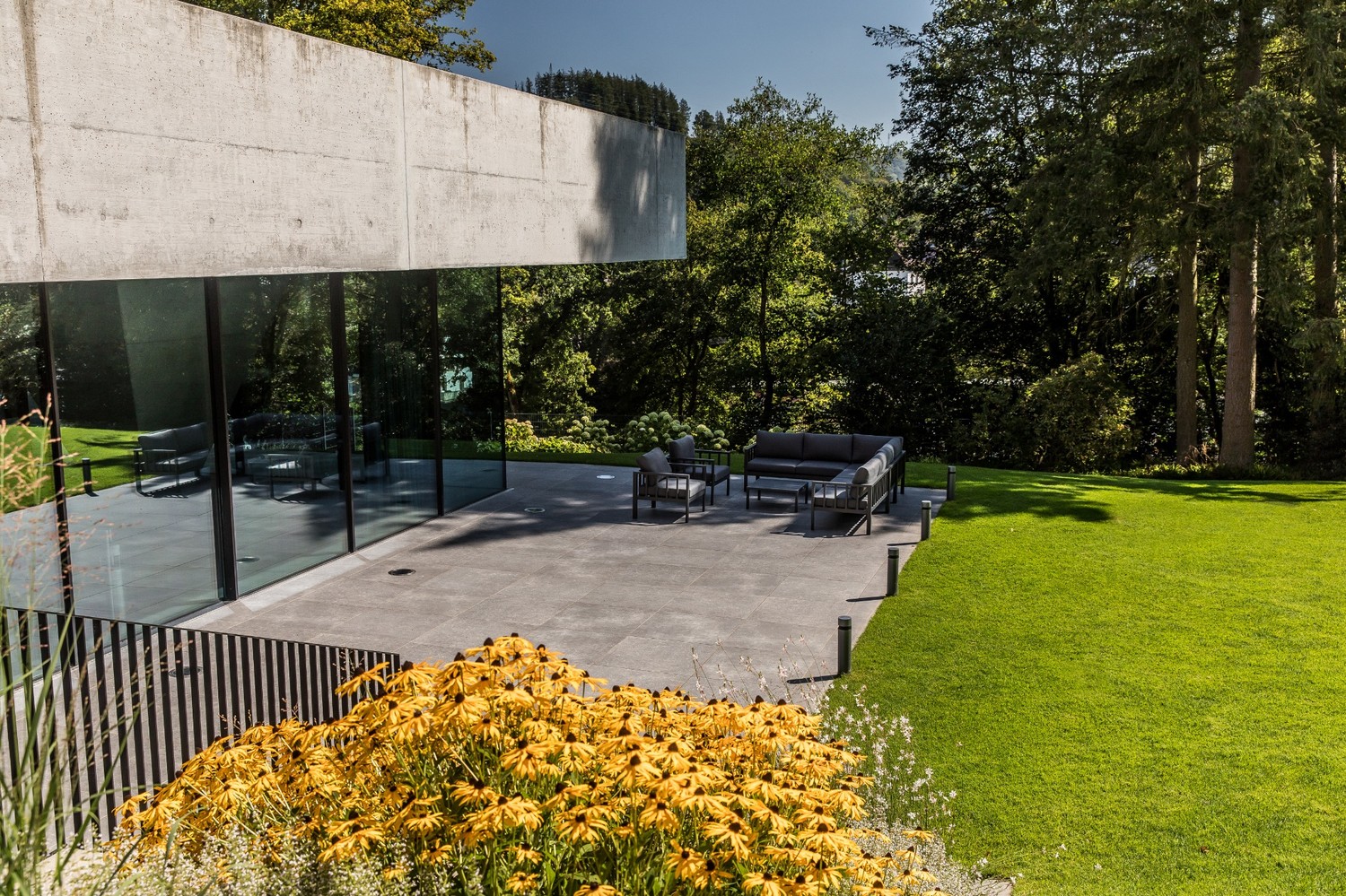 Die Gründervilla der Firma Jung, ein Premiumanbieter für Gebäudetechnik, wurde sehr aufwändig umgebaut und bekam einen modernen Anbau. Unser Betrieb hat die Landschaftsbauarbeiten ausgeführt.