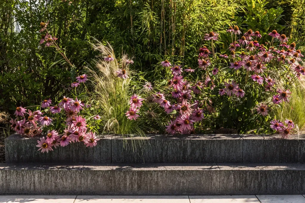 - Den grünen Rahmen bildet eine Pflanzung mit Stauden und Gräsern.