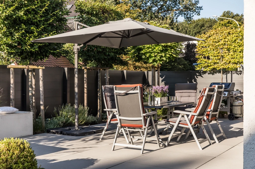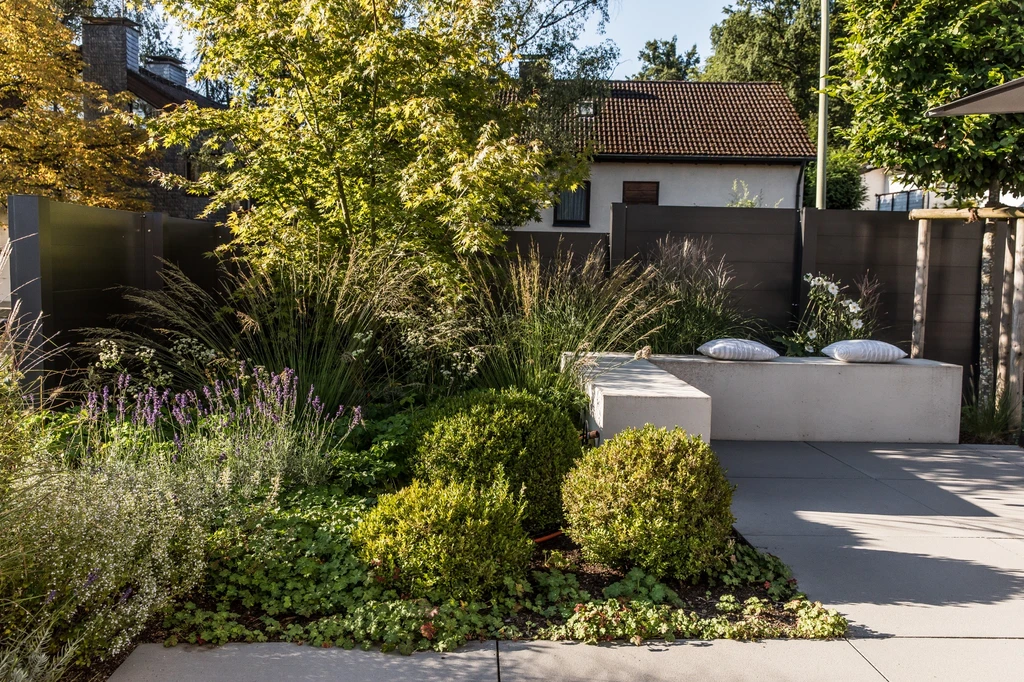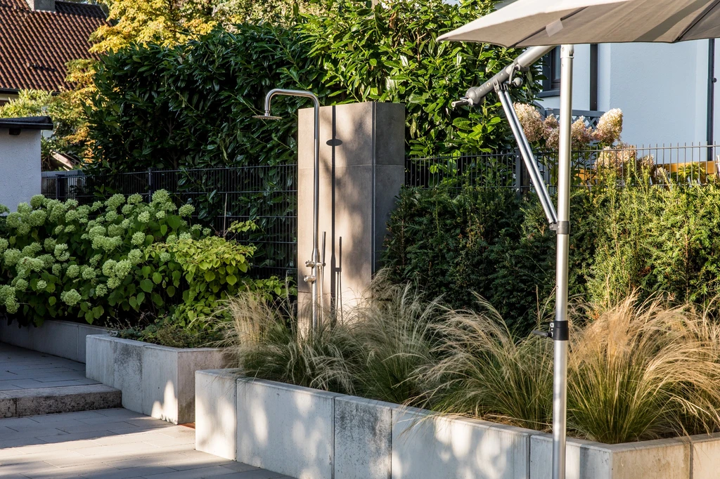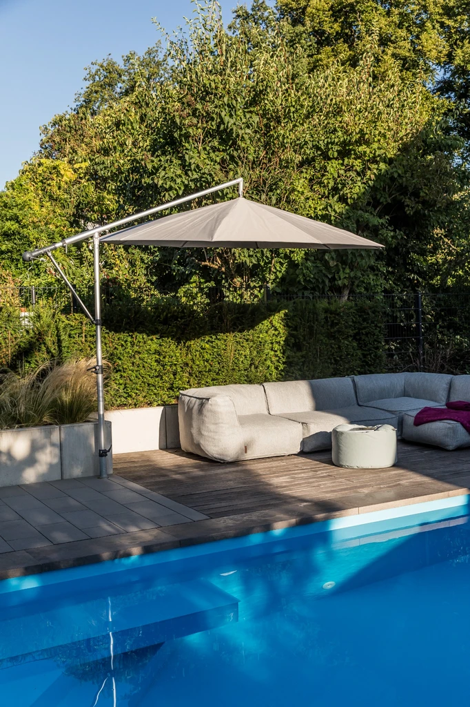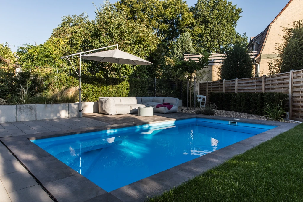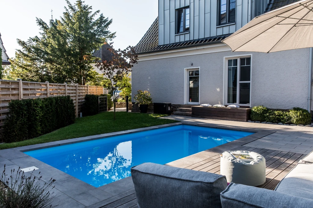 Die Bewohner haben sich einen Pool und eine gemütliche Sitztterasse gewünscht. Wir haben diese Idee gestalterisch und baulich umgesetzt.